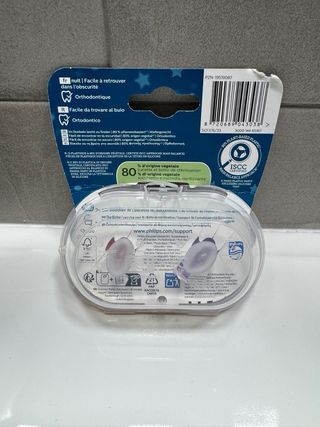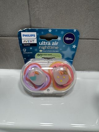 Pack de dos chupetes Philips Avent Ultra Air Nighttime para bebés de 18 meses en adelante. Son fáciles de encontrar en la oscuridad. - Diseño ultra air para mayor transpirabilidad. - Aptos para la noche, brillan en la oscuridad. - Incluye estuche para esterilizar y transportar. - Fabricados con un 80% de materiales de origen vegetal.