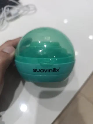 SUAVINEX ESTERILIZADOR DE CHUPETES PORTATIL Esteriliza en 3 minutos, elimina gérmenes en un 99%, sin agentes químicos, utiliza rayos UV. Es compacto y fácil de transportar, ideal para esterilizar en la calle o cuando se va de viaje. Funciona enchufado o mediante pilas. *No contiene pilas (AAA) - Color verde. - Diseño esférico. Se abrió para probarlo y ver que funcionase pero nunca se ha llegado a usar porque mi hija no ha querido chupetes. Hago envíos (seleccionar InPost preferentemente), pero no regateo. Se encuentra en su caja original.