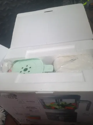 Robot de cocina Suavinex en color blanco y gris. Ideal para preparar alimentos de forma rápida y sencilla. - Diseño moderno y compacto. - Jarra de acero inoxidable. - Asa ergonómica para un fácil manejo. -Con 5 funciones: cocinar al vapor, triturar, calentar, descongelar e incluso esterilizar pequeños accesorios -Incluye: arrocero, cesto para alimentos de 1, 1 litros, espátula para remover, jarra de acero inoxidable de 1, 7 litros y tapa con sistema de seguridad -Jarra y cuchillas de acero inoxidable anti-gérmenes/anti-bacterias y resistente a altas temperaturas Apagado automático NUEVO SIN USO