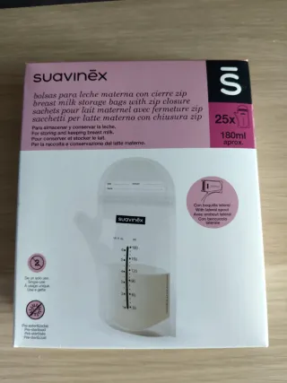 Pack de 25 bolsas de almacenamiento para leche materna de la marca Suavinex. Son de un solo uso y vienen pre-esterilizadas. Totalmente nuevas, con el precinto sin abrir, como se puede ver en la foto. - Cierre zip. - Capacidad aproximada de 180ml. - Con boquilla lateral para verter.