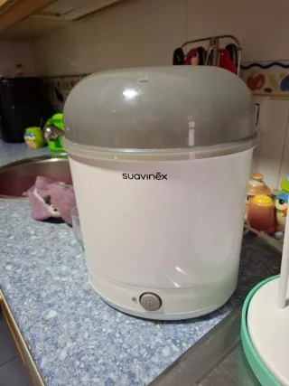 Esterilizador de Suavinex. Es eléctrico pero tiene accesorios para esterilizar en microondas para viajes etc… Sin uso, utilizado en un par de ocasiones, en perfecto estado como nuevo. Se entrega en su caja original