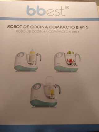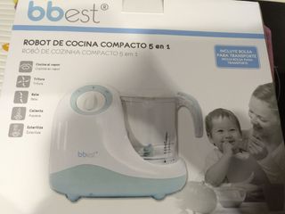 marca bbest corte inglés. cinco funciones en un aparato. esteriliza, cocina al vapor, tritura, bate y calienta. comprado hace 4 años, se le ha dado poco uso. una única vez cocinado al vapor, se ha usado más para triturar. puedes ver la cuchilla cómo está. la tapa tiene una muesca rota pero no entorpece el funcionamiento. lleva bolsa para transporte que ni se ha abierto, instrucciones, va en su propia caja. de color blanco. goma de recambio. costo 79'90€ lo dejo en 55€.