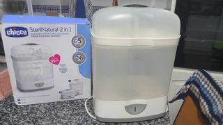 Esterilizador Chicco SterilNatural 2 en 1, práctico y eficaz. - Elimina el 99.9% de los gérmenes. - Ciclo de esterilización de 5 minutos. - Mantiene los objetos esterilizados hasta por 24 horas.