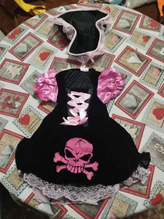 Disfraz de pirata para niña con detalles en negro y rosa. Talla: 2/4 años - Vestido con mangas abullonadas. - Estampado de calavera y huesos cruzados en rosa. - Adornos de encaje rosa en el bajo y el cuello. - Incluye sombrero de pirata a juego y enaguas bajo el vestido