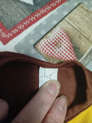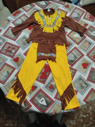 Disfraz de indio para niño, ideal para fiestas temáticas o carnaval. El conjunto incluye un top y pantalones. - Top marrón con detalles amarillos y flecos. - Pantalones amarillos con flecos marrones en los bajos. - Cinturón decorativo con diseño tribal.