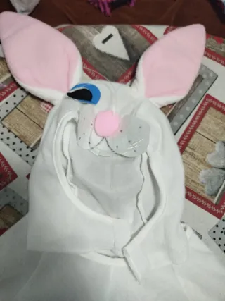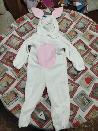 Disfraz de conejo para niños, perfecto para fiestas o carnaval. Talla 5/6 años - Mono completo blanco. - Orejas de conejo rosas. - Detalle de barriga rosa. Le falta un ojo por eso lo pongo más barato pero es fácil hacerselo