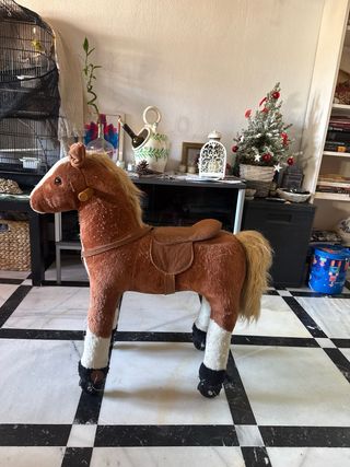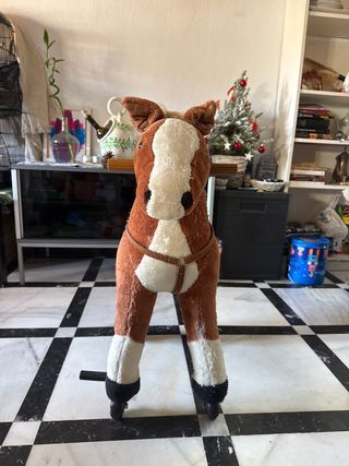 Caballo balancín de peluche en color marrón, ideal para que los más pequeños disfruten. Al pulsar las orejas hace sonido. - Peluche suave al tacto. - Diseño de caballo con crin y cola. - Ruedas para facilitar el movimiento.