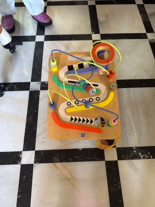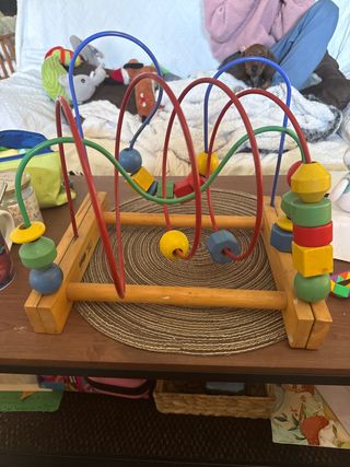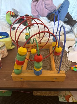 Juguete de desarrollo motriz con piezas de madera y alambre. - Base de madera. - Alambres de colores con cuentas. - Piezas de madera de diferentes formas y colores.