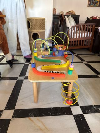 Mesa de actividades de madera con diseño de Pinball Circus. - Tablero de madera con cuentas y laberintos. - Elementos de juego coloridos. - Base de madera natural.