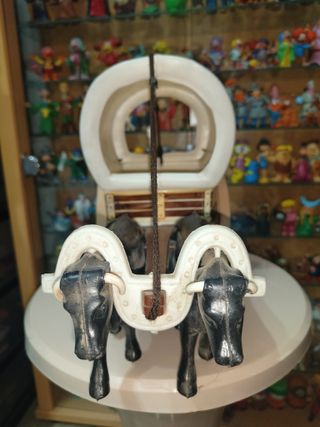 Carreta decorativa de la Virgen del Rocío, con un diseño que evoca los años 80 y 90. Ideal para coleccionistas. - Carreta con dos bueyes negros. - Detalle de la Virgen del Rocío en el lateral. - Rueda de carreta de color beige.
