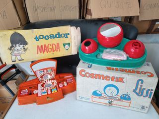 RESCATADOS DE ANTIGUO ALMACEN DE JUGUETES ABANDONADO DE AHÍ EL ESTADO DE LAS CAJAS DEBIDO A UN MAL ALMACENAMIENTO. AUNQUE LOS JUGUETES ESTAN NUEVOS SIN USO APRECIAR LAS FOTOS PUES UNO DE ELLOS PRESENTA ALGUN DESPERFECTO. LOTE FORMADO POR : * PRECIO SET DE MAQUILLAJE Y COSMETICA " COSMETIK LISSI " FABRICADO EN ESPAÑA EN LOS AÑPS 70 / 80 . AUNQUE LA CAJA PRESENTA MARCAS DE MAL ESTADO , COMO SE APRECIA EL JUGUETE ESTA SIN USO Y COMPLETO ( COMPLEMENTOS HASTA EN SU BOLSITA AUN SIN ABRIR ) * Y TOCADOR " MAGDA " . ORIGINAL AÑOS 70 /80. ANTIGUO TOCADOR TAL Y COMO SE APRECIA EN FOTOS . no nancy