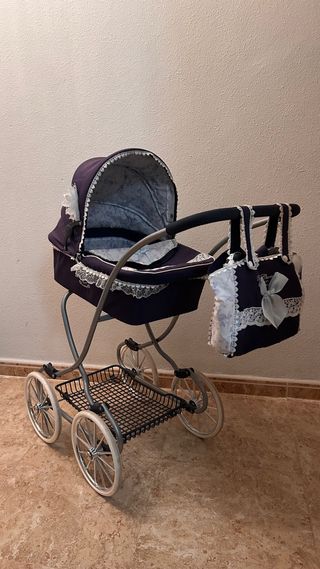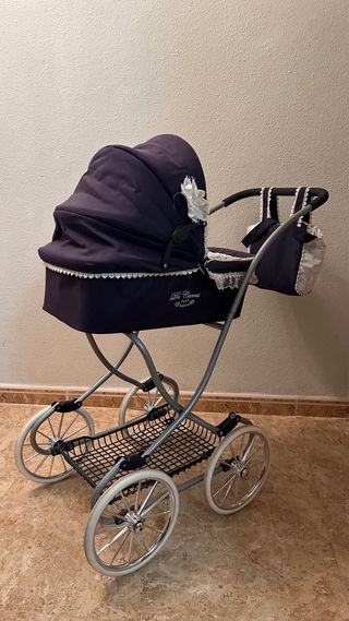 Carro de muñecas de estilo clásico y marca reconocida. - Color azul marino con detalles en blanco y encaje. - Incluye capazo y cesta inferior. - Viene con bolso a juego. Posibilidad de incluir bebé Reborn.