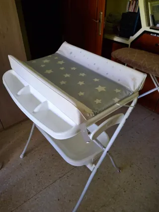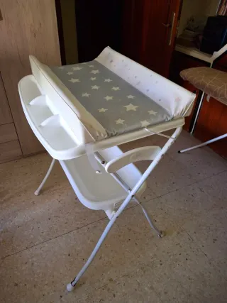 Cambiador para bebé que incluye una bañera integrada. Ideal para el cuidado diario del recién nacido. - Estructura blanca. - Colchoneta con estampado de estrellas.