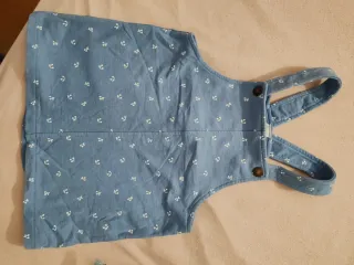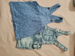 Lote de 9 prendas de ropa para niña de 3 a 4 años. - Un peto vaquero con efecto desgastado y bolsillos. - Un peto azul claro con estampado de anclas blancas. - Sólo jeans - 4 camisetas - 2 sueteras