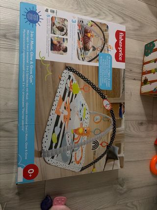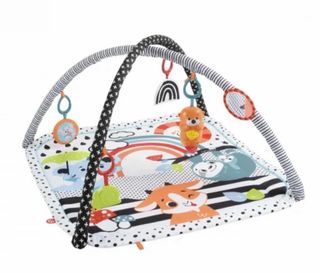 Manta de actividades para bebés con arco de juegos y varios colgantes. - Diseño con animales, arcoíris y elementos de la naturaleza. - Incluye peluches y sonajeros. - Colores blanco, negro y toques de color.