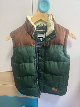Chaleco acolchado de niño de la marca Pepe Jeans. - Color verde y marrón. - Cuello forrado de borreguito. - Cierre de botones a presión. -Talla 12 años, XS, 152cm Precio original 90€