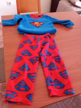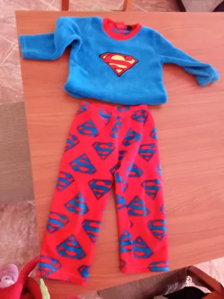 Conjunto de pijama infantil con diseño de Superman. - Parte superior azul con el escudo de Superman. - Pantalón rojo con estampado de escudos de Superman en azul. Talla de 2 a 3 años, 98 cm.