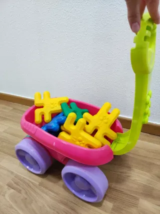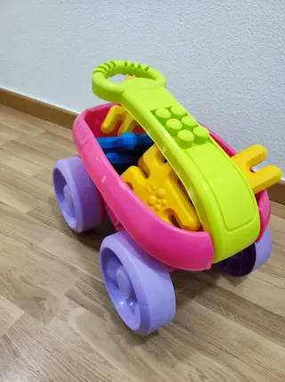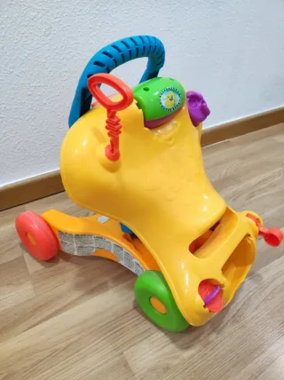 Divertido andador y correpasillos para bebés con múltiples juguetes. - Diseño en color amarillo. - Asa de empuje azul. - Ruedas de colores (rojo y verde). - Juguetes integrados en la parte frontal.