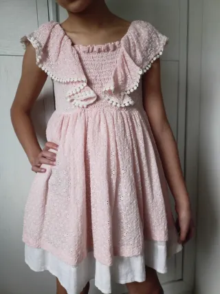 Vestido niña en color rosa. Ideal para eventos especiales(bautizo, comunión,boda,etc...)talla 10 años - Tejido lino 50%-algodon50% con detalles bordados. - Cuerpo fruncido y volantes. - Bajo con forro blanco,usado 1 vez como nuevo...