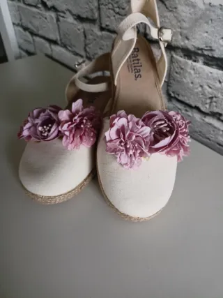 Alpargatas de tela color crudo con detalle de flores en tono lila,talla 34 cuña de 2'5cm-usado 1 vez como nuevo... - Cierre con pulsera al tobillo. - Suela de esparto.