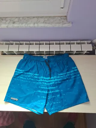 El bañador que aparece en la imagen es el modelo 100 Short Surfing Boardshorts "Blue Waves" de la marca Olaian, que se vende en Decathlon Sus caracteristicas de eate productos serían: Diseño: Presenta un color azul turquesa con un patrón de ondas o rayas horizontales en un tono más claro. Funcionalidad: Está diseñado para sesiones de surf de corta duración (hasta una hora) en aguas cálidas. Comodidad: Incluye un calzoncillo interior de malla para evitar irritaciones y una cintura elástica con cordón ajustable. Tejido: Fabricado con un material elástico en dos direcciones que favorece la libertad de movimiento.