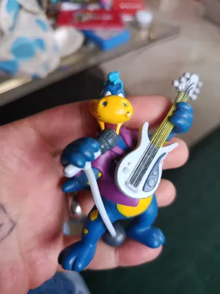 Figura coleccionable de un personaje tipo Danino tocando la guitarra y cantando. - Figura de plástico azul con detalles amarillos. - Viste una camiseta morada y un chaleco. - Sostiene una guitarra blanca y un micrófono.