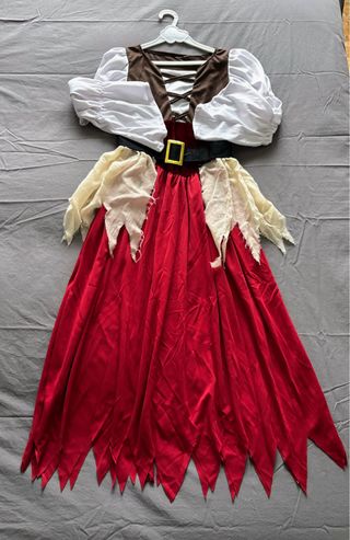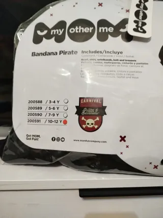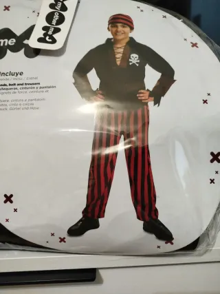 Disfraz de pirata para niño, talla M. Incluye todo lo necesario para una aventura. - Camisa con cordones y calavera. - Pantalones a rayas rojas y negras. - Pañuelo a juego. - Cinturón.