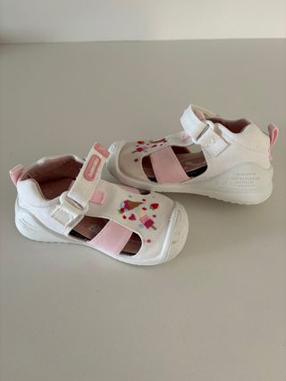 Preciosos zapatitos de verano para bebé, marca Biomecanics y perfectos para los días más cálidos. Tienen un diseño divertido con helados y fresas bordados. - Cierre de velcro para un ajuste fácil. - Suela flexible. - Forro interior suave. - Talla 21.