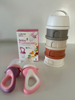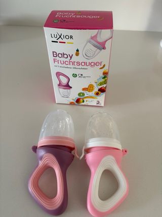 Set de dos chupetes o dosificadores de fruta para bebés, ideales para introducir alimentos sólidos de forma segura. Incluye una caja con información adicional. - Dos unidades en colores rosa y morado. - Diseño ergonómico con asa. - Tapa protectora para el chupete. - Caja con diseño ilustrado de frutas. - Sin usar - Dosificado leche en polvo marca BEABA, ideal para viajes, usado poco.