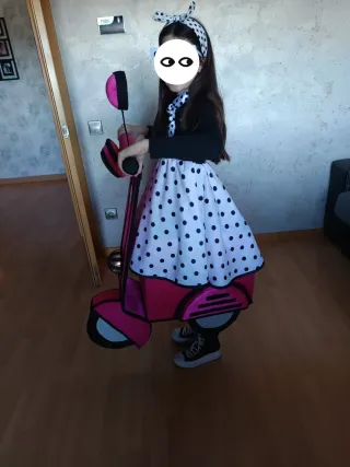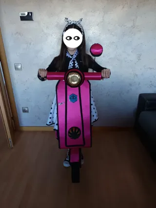 Disfraz de Vespa para niña, ideal para fiestas o carnaval. Este disfraz está diseñado para ser divertido y llamativo. Disfraz completamente hecho a mano con todos los detalles incluso la luz trasera. - Diseño inspirado en la icónica Vespa. - Incluye moto vespa, falda, pañuelo, gafas y diadema. - Talla de 7 a 14 años ( abarca diferentes tallas ya que todo se regula con gomas). - Utilizado solo la tarde de carnaval. - Posibilidad de comprar el mismo disfraz también para adulto.