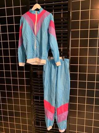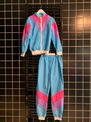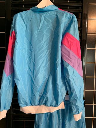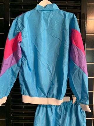 Conjunto de chándal de estilo retro de los años 80. - Chaqueta con cremallera frontal. - Pantalón con cintura elástica. - Diseño con paneles de colores. - Tejido ligero y brillante.
