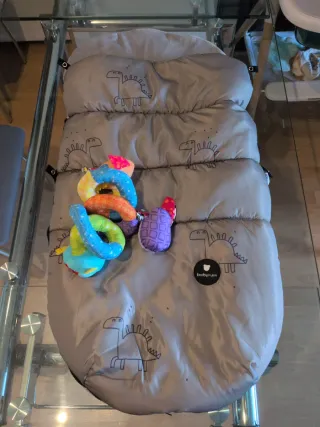 Conjunto de saco para carrito de bebé marca bimbipirulos y espiral de juego con divertidos muñequitos - Saco acolchado gris con estampado de dinosaurios. - Espiral de juego multicolor con diferentes texturas y sonajero.