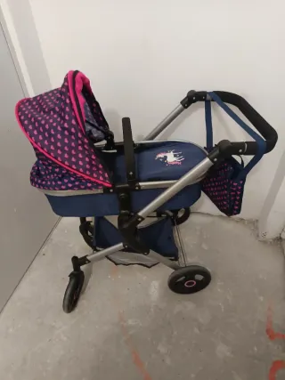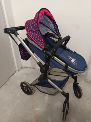 Carro de muñecas con un diseño divertido y colorido. - Manillar regulable a tres alturas - El capazo es cuco y se convierte también en silla, dos posiciones del capazo ( mirado a la persona que lleva el carro o mirando hacia delante) - Capota regulable - Las ruedas delanteras giran completamente. - El carro se puede plegar y queda en dos piezas - Tiene todos los accesorios como se aprecian en la foto ( arnés, cesta, bolso, cubre capazo)