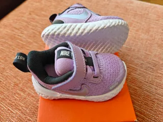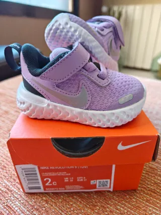 Zapatillas deportivas Nike Revolution 5 para bebé en color lila y plateado. **SIN ESTRENAR - COMPLETAMENTE NUEVAS** Las compré para un regalo que finalmente no hice y se me pasó plazo de devolución. En su caja. - Modelo: Revolution 5 (TDV) - Talla: 2c (UK 1.5 / EUR 17) - Color: Lila/Metallic Silver