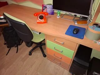 Conjunto de muebles para habitación infantil/juvenil. Compuesto por: - Armario con puente de madera maciza. - Estante decorativo morado. Tableros de 16mm. Grosor que aguanta los pesos perfectamente. La habitación es en color madera y lila. Las zonas en gris se pueden quitar ya que son unas láminas pegadas. Está en perfecto estado, salvo la bandeja del teclado (se puede arreglar quitando el remate del tablero y volviéndolo a forrar) y el somier de la cama superior se debería cambiar por uno nuevo de ahí el precio tan bajo. ##NO están incluidos los peluches, muñecos y demás objetos##