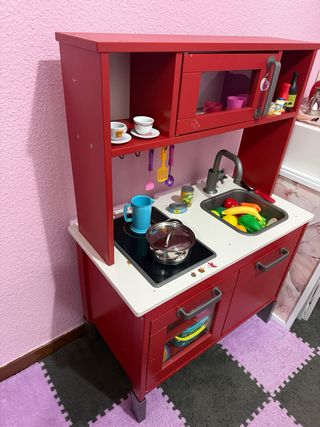 Divertida cocina de juguete para niños, ideal para horas de juego imaginativo. Su diseño en color rojo la hace muy atractiva. - Incluye accesorios como tazas, platos, ollas y utensilios de cocina. - Cuenta con horno, fogones y fregadero. - Estanterías para organizar los accesorios.