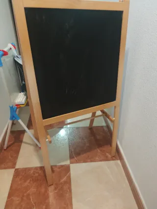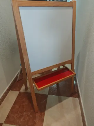Pizarra de madera con un diseño clásico y funcional. Perfecta para dibujar o escribir. - Estructura de madera. - Bandeja de color rojo para materiales. De Ikea . Signos de uso por eso el precio .