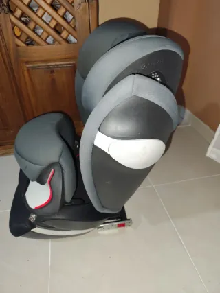 Silla de coche modelo Cybex para bebés. - Diseño en color gris y negro. - Detalles en rojo y blanco.