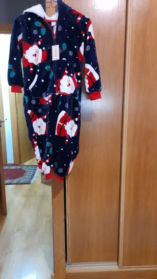 Pijama entero con estampado de Papá Noel y copos de nieve. - Diseño navideño. - Tejido suave y cálido. - Cierre de cremallera frontal. - Puños y tobillos elásticos.