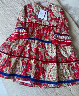 Vestido infantil con un bonito estampado. - Diseño de volantes. - Mangas largas. - Detalle de cintas de terciopelo y azul.