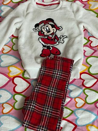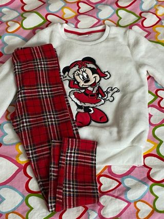 Conjunto de jersey y pantalón para niña, ideal para la temporada navideña. - Jersey blanco con estampado de Minnie Mouse vestida de Navidad. - Pantalón de cuadros rojos, negros y blancos.