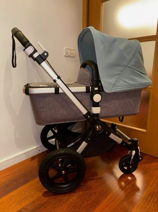 Cochecito Bugaboo original, usado, en buen estado general. Tiene signos normales de uso (marcas estéticas del día a día), pero funciona perfectamente y está listo para usar. Incluye: ✔️ Capazo Bugaboo (apto desde recién nacido) ✔️ Capota azul ✔️ Capota gris ✔️ Funda de lluvia original Bugaboo ✔️ Chasis robusto y estable ✔️ Cesta inferior amplia ✔️ Ruedas en buen estado de funcionamiento Carrito muy cómodo y manejable, ideal para ciudad y paseos largos. Marca premium, muy resistente y duradera.