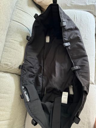 Saco de invierno Bugaboo en color negro. Acolchado. Cierre con cremallera impermeable. Adaptado para silla city Mini GT (corte/arreglo para acceder al cierre rápido y cortada la tira de anclaje original para poder atarlo a cualquier silla) y cambiada la cremallera de la funda del relleno interior por un velcro.