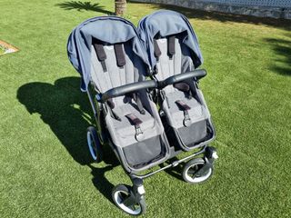 Solo Sevilla y alrededores. Carrito gemelar Bugaboo Donkey 5 en color gris y azul. Para 2 bebés desde su nacimiento. Estructura muy resistente y ligera. El manejo del carrito es muy bueno, muy cómodo y por sus ruedas grandes sobrepasa los obstáculos con muy poca dificultad. Se compone de: - chasis - 2 capazos - 2 sillas - 1 cesta - 2 fundas para lluvia. Todo de mediados de 2022. Los capazos tienen unos 5 meses de uso, y las sillas unos 2 años y 7-8 meses. Desmontable en 3 piezas y plegar así para mayor comodidad de transporte. Los mangos tienen ciertos signos de desgaste, pero no condicionan el uso ni dan una apariencia de viejo.