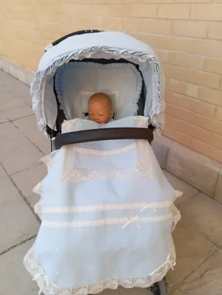 Preciosa funda para capazo de la marca Dolores Baby, en color azul celeste con lunares blancos. Incluye dos piezas: una funda para el capazo y el cubre capazo. - Tejido suave y de buena calidad. - Diseño elegante y delicado. - Perfecto estado.