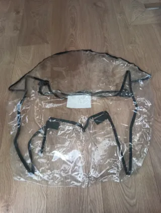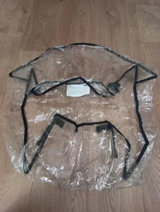 Funda protectora transparente para cochecito de bebé. Diseñada para proteger del viento y la lluvia. - Material de plástico transparente. - Ribete negro. - Cierres de sujeción con velcro.