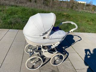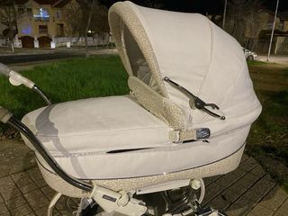 Cochecito de bebé en color blanco roto, con capota y detalles en el mismo tono. De la marca Bebecar, colección Privé, que tienen unas telas especiales y son los mas caros de la marca. El chasis es metálico y las ruedas, tienen un diseño clásico. - Capota ajustable. - Ruedas con radios, las delanteras pueden girar para un mejor manejo o mantenerse fijas. - Chasis cromado. - gran suspensión, ideal para mecer. - incluye sillita de paseo - doble colchón y funda del mismo - capazo con respaldo reclinable a varias alturas - precio de mercado 1250€