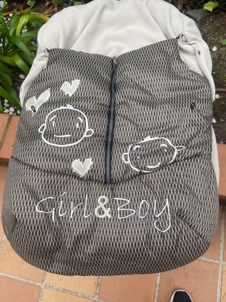 Funda acolchada para cochecito con un diseño tierno de Girl & Boy. Ideal para mantener al bebé abrigado y cómodo. - Diseño con corazones y caritas de bebé. - Cremallera central. - Tejido exterior estampado y forro interior suave.