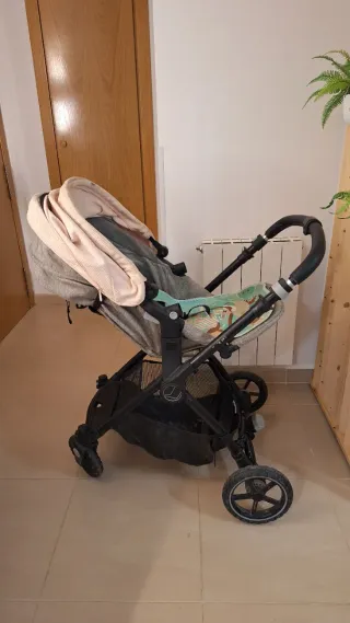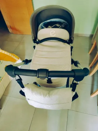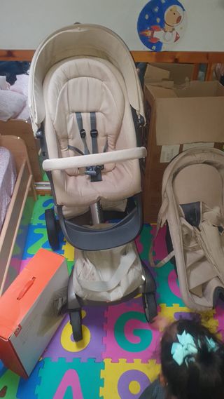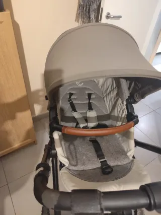 Cochecito de bebé en color beige, ideal para paseos cómodos. - Capota extensible. - Asiento acolchado. - Barra de seguridad. - Arnés de 5 puntos. -dos fundas -completo con todo accecoirios yo compre con 620€