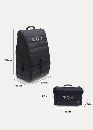 Funda de transporte universal Bugaboo, ideal para proteger tu carrito. Precio a negociar. - Color: Negro. - Dimensiones aproximadas: 100 cm (alto) x 49 cm (ancho) x 69 cm (profundidad). - Incluye bolsa adicional de 22 cm x 46 cm x 69 cm.